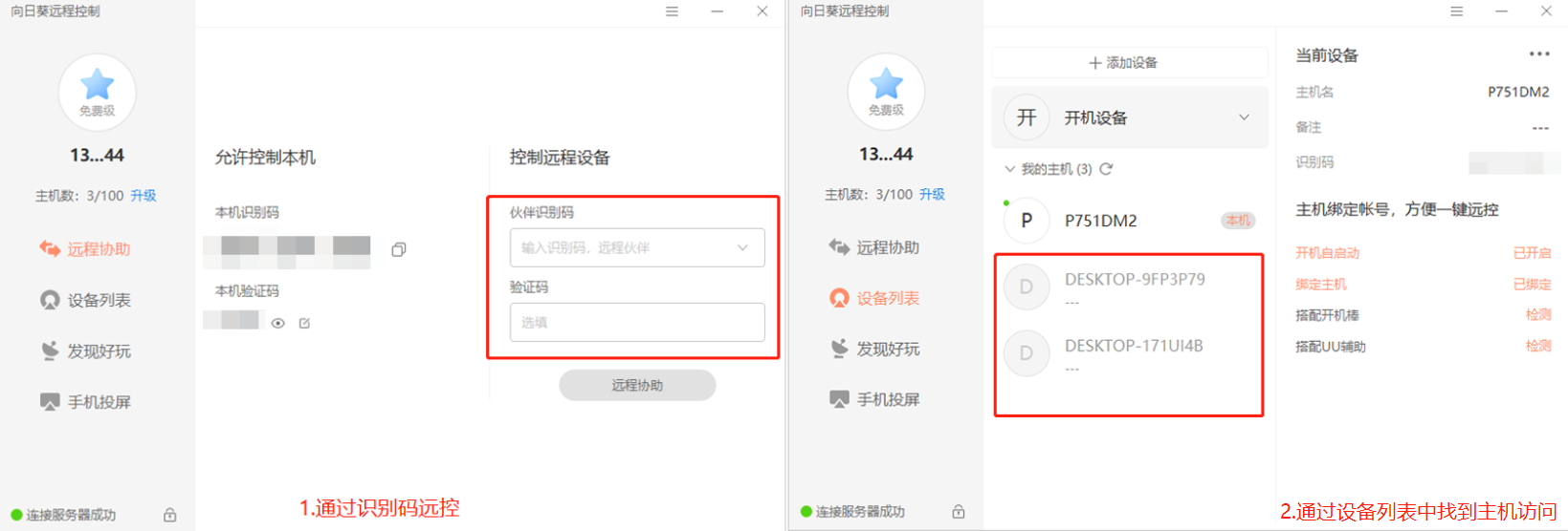 安装后,如果两台主机在同一个帐号下,直接在设备列表中进行远控,当然也可以通过识别码来访问,这样操作会更加简单些。