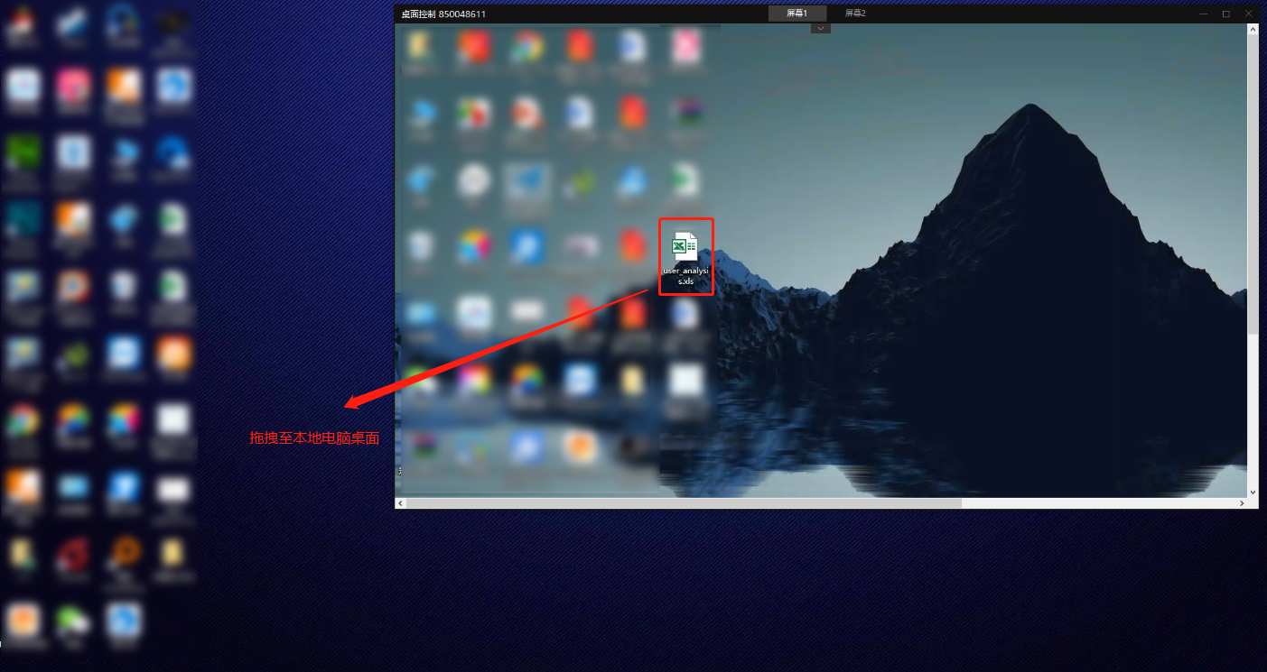 向日葵远程文件的途径有两种,第一种是本地电脑在与被控电脑建立起连接后,直接将被控电脑的文件拖拽至本地电脑桌面,操作逻辑简单且具人性化。不过仅支持小文件拖拽传输,如果进行一些大文件远程传输,就需要使用第二种方式。