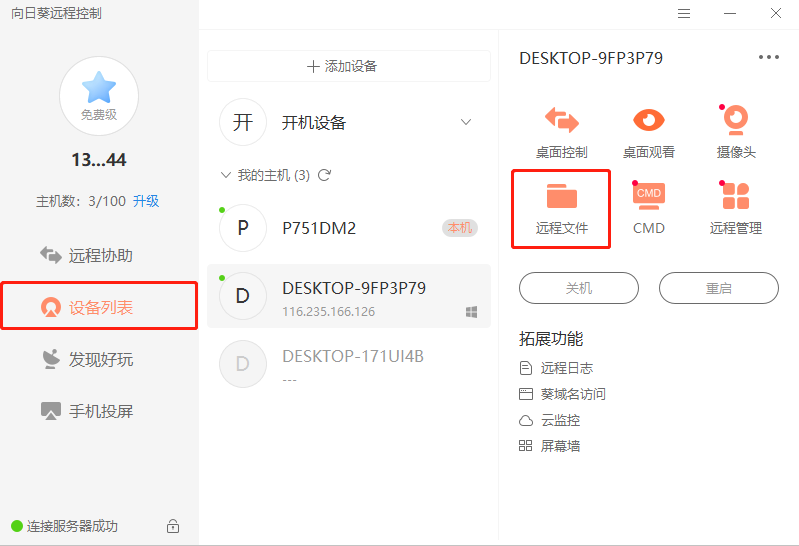 第二种传输方式建立在被控电脑已经绑定至帐号的前提下,随后在设备列表中找到并点击被控电脑,在右侧跳出的功能栏里找到远程文件功能。